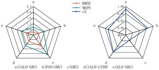 In the above evaluation indexes, lower RMSE and MAPE values and higher values all indicate better fit and higher prediction accuracy. As can be seen from Figure 8, the IALO-GRU model based on normal operation data performs the best on the root mean square error (RMSE) and average absolute percentage error (MAPE) and has the best fit, indicating that it can quickly and accurately detect abnormalities when failure occurs.