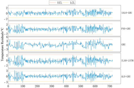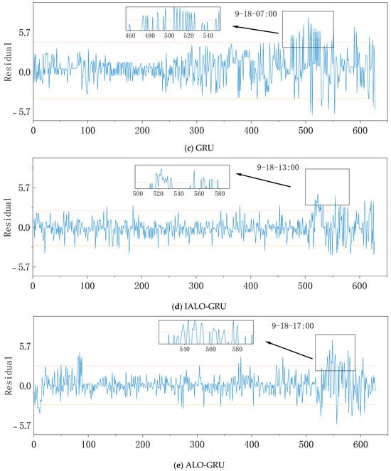 The fault sample test set data are the SCADA data from 0:00 to 8 a.m. on 19 September 2022. As shown in the above experiments, the IALO-GRU model training based on normal running data showed better fitting ability and a smaller threshold range. The theoretical performance should have a better fault identification ability. To confirm this point of view, the abnormal sample test experiment’s results are shown in Figure 12, as well as the IALO-GRU model on the 17th. And the alarm’s frequent residual beyond the threshold range in the following time confirmed that the model can effectively predict a fault and alarm in time. The frequent alarms in the other models were relatively late. The PSO-GRU model detected the residual oil temperature beyond the threshold at 1 a.m. on the 18th. The GRU model alerted at 6 a.m. on the 18th. The IALO-LSTM alerted at 8 am on the 18th, and ALO-GRU triggered the alarm at 10 am on the 18th. However, the IALO-LSTM and PSO-GRU had failed alarms during normal operation, probably because of improper threshold range setting in these models, resulting in poor fitting with abnormal samples and triggering false positives.