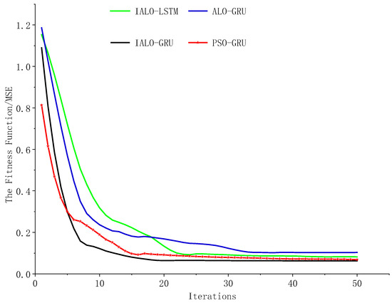 To evaluate the performance and fitting effect of the IALO-GRU algorithm during parameter optimization, the fitness function’s MSE values, shown in Figure 11 show that the modified IALO-GRU model stabilized after 21 iterations. Relatively, the PSO-GRU model also stabilized after 15 iterations, but its loss value was slightly higher than the IALO optimization algorithm compared to the LSTM prediction method. The GRU network shows a faster convergence rate and smaller loss values under the same optimization algorithm. Thus, the improved IALO-GRU model exhibits faster convergence under the present experimental conditions, thus verifying the advantages of the proposed IALO-GRU algorithm in the solution process.