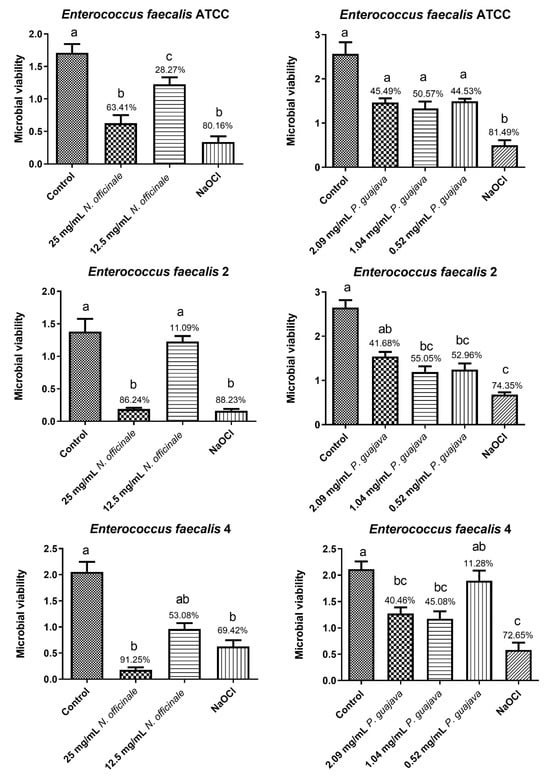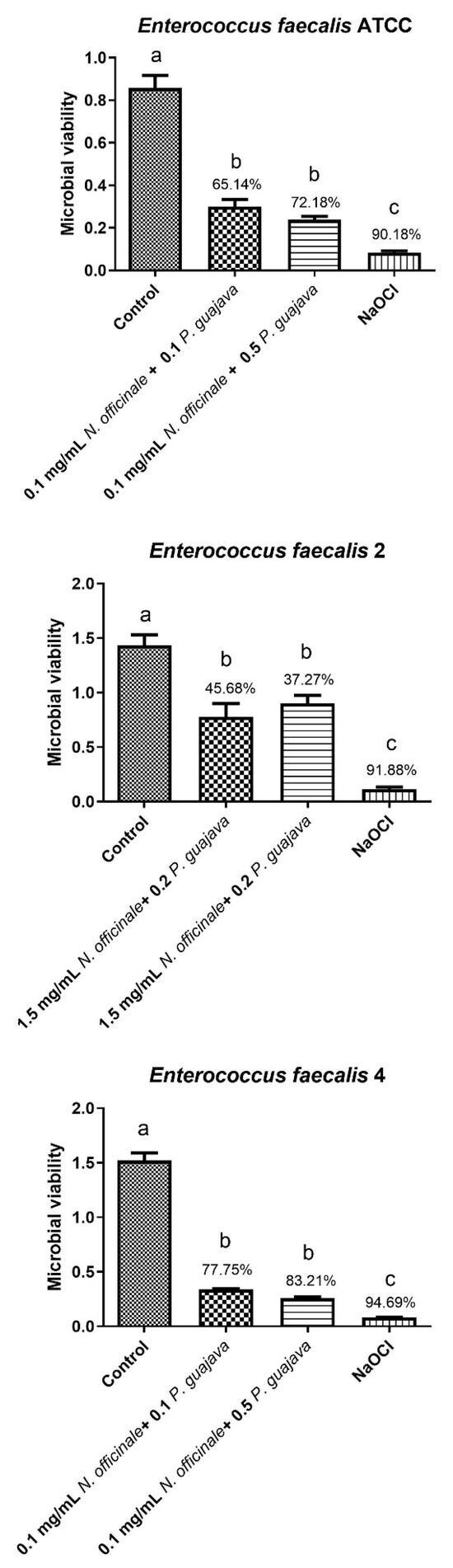 The microbial viability of the standard and clinical strains of E. faecalis after treatment with the combined extracts. Different letters (a, b, and c) indicate a statistically significant difference among the tested groups.