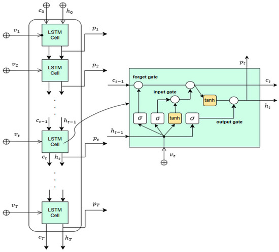 The architecture of an LSTM layer with T time steps and the structure of an LSTM cell is illustrated in Figure 1, where the input time series data are denoted as , and the output values are represented as .