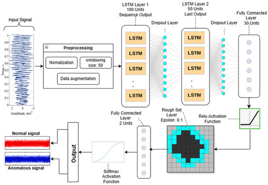 In this study, a novel approach called RoughLSTM is proposed. This method integrates the LSTM model, commonly used in time series data analysis, with RST in order to overcome the limitations of LSTM and obtain more reliable results, particularly for complex problems such as anomaly detection. Although LSTM has shown considerable success in time series analysis, it generates outputs based on exact classification thresholds, which may lead to false positive or false negative results, especially when dealing with uncertain or ambiguous data. Rough set theory, on the other hand, models these uncertainties explicitly, offering a more flexible approach to the classification process. RoughLSTM combines the strengths of LSTM in time series analysis with the uncertainty management capabilities of RST. This enables a clearer distinction between the regions of certain and uncertain classes. The proposed architecture begins with a preprocessing phase that includes normalization, windowing with a size of 50, and data augmentation for time series inputs. The core structure consists of two LSTM layers with 100 and 50 units, respectively, separated by dropout layers to prevent overfitting. The model incorporates two fully connected layers—an initial layer with two units and a final layer with thirty units—utilizing ReLU activation functions throughout and Softmax activation in the output layer. A key feature of this architecture is the rough set layer with an epsilon value of 0.1, which processes the outputs to classify signals as either normal or anomalous. In particular, handling examples in boundary regions more accurately enhances the overall accuracy of the model and allows for more reliable classification of uncertain data. The working mechanism of the proposed RoughLSTM model is schematically illustrated in Figure 2. This diagram presents the data flow, components, and processing steps of the model in detail. Additionally, the internal functioning of the rough set layer in the RoughLSTM model is explained in detail, and an operational diagram is provided in Figure 3 to visualize this process.