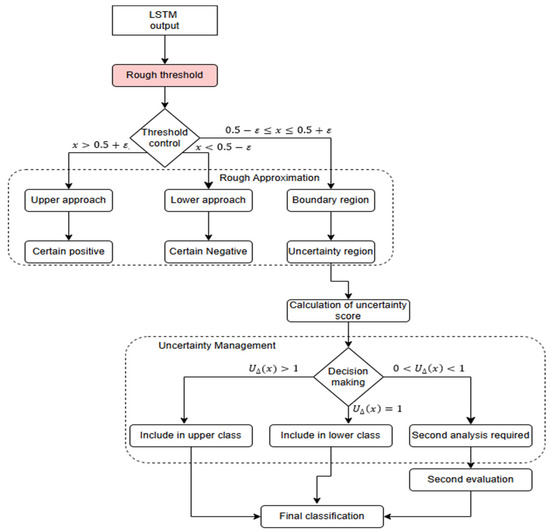 In this study, RST is used to process the outputs of the LSTM model. The LSTM model processes the time series data and generates an output value for each time step. These output values are typically expressed as a probability score (e.g., in the range of [0, 1]). However, classifying these scores based on an exact threshold value (e.g., 0.5) may result in incorrect outcomes for ambiguous examples. To address this issue, an uncertainty threshold (ε) is introduced, which is determined heuristically based on the distribution of model outputs. The selection of ε is guided by empirical analysis, ensuring that the boundary region effectively captures ambiguous cases while maintaining a balance between false positives and false negatives. This threshold is optimized according to the data distribution and determines the precision of the model. In this context, the uncertainty region () is defined as follows: