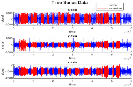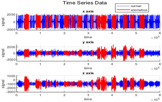 Figure 4 visually presents the temporal behavior of vibration data measured during different operations, along with potential anomalous signals. The performance of the models on this time series is analyzed in detail based on various metrics, including accuracy–loss, confusion matrix, and the ROC curve, which are respectively illustrated in Figure 5, Figure 6 and Figure 7.
