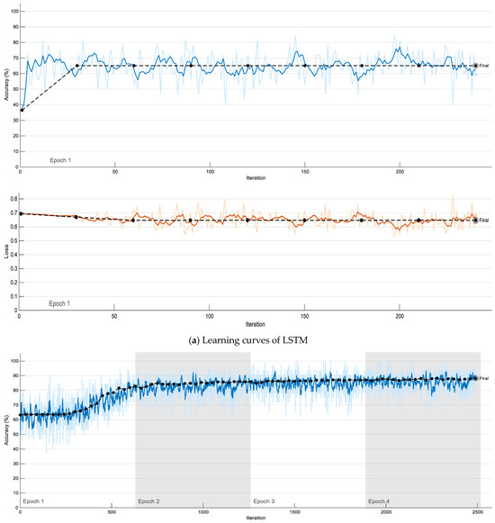 In Figure 1, represents the output, also referred to as the hidden state, while denotes the cell state at time step . A standard LSTM cell consists of sigmoid () and hyperbolic tangent activation functions (tanh), along with pointwise addition () and multiplication () operations. By updating the gates on the memory cell —namely, the input gate (, forget gate , and output gate —the LSTM can predict the target variables . In an LSTM layer, the learnable weights are divided into three groups: input weights (), recurrent weights (), and bias (). These matrices represent the concatenated input weights, recurrent weights, and bias values for each component. The layer combines these matrices according to the following equations.