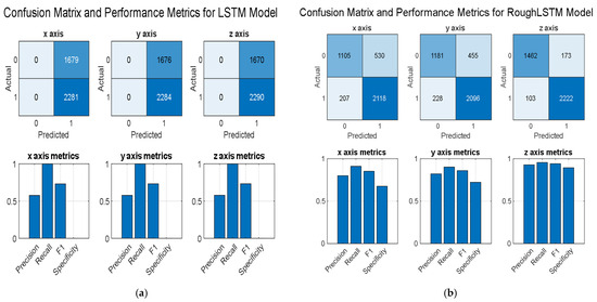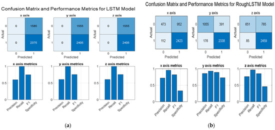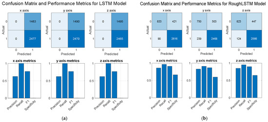In this study, the accuracy values of the LSTM and RoughLSTM models were compared through experiments conducted on MO1, MO2, and MO3 machines, and the results are given in Table 7. The results indicate that RoughLSTM achieved higher accuracy across all machines and axes compared to LSTM. While the accuracy of LSTM models generally remained in the 60–70% range, RoughLSTM demonstrated superior performance, ranging from 73% to 90%. When analyzed on a machine basis, RoughLSTM achieved 17%, 18%, and 23% higher accuracy on the x, y, and z axes, respectively, for the MO1 machine. For the MO2 machine, the most significant improvement was observed on the y-axis, where RoughLSTM outperformed LSTM by 24%. For the MO3 machine, RoughLSTM demonstrated a performance advantage of 15–20% over LSTM across all axes, further highlighting its superiority. Additionally, the highest values are indicated in dark color and in all other tables, dark color represents the highest value.