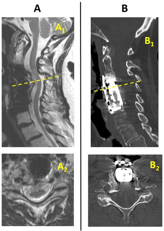 Pre-operative imaging studies: MRI scan (A) and CT scan (B) demonstrating degenerative disease and critical stenosis of the spinal canal. Sagittal views (A1,B1) and transverse views at the level of the C4 vertebral body (A2,B2).