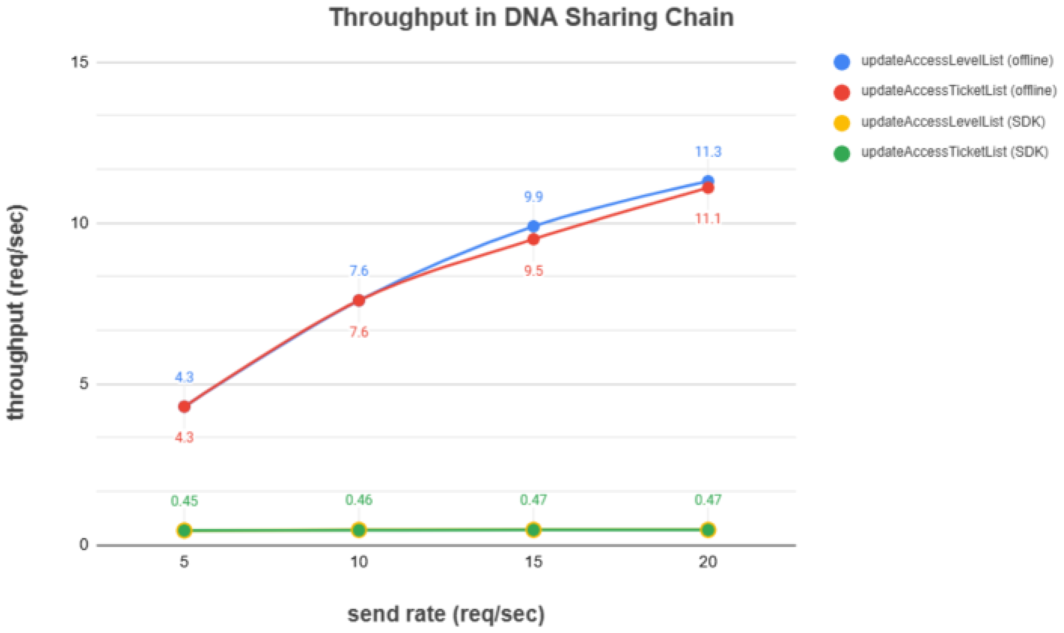 DNA Sharing Chain: Throughput in the DNA sharing chain was evaluated for the updateAccessLevelList and updateAccessTicketList operations, as shown in Figure 13. Offline signing demonstrated superior performance, achieving approximately 10 requests per second, compared to less than 1 request per second for the official SDK. The discrepancy arises from the official SDK’s reliance on peer node connections and network communication, whereas offline signing enables users to prepare and sign transaction proposals locally before direct submission. In this system, updateAccessLevelList utilizes offline signing for frequent user updates, while the less frequent updateAccessTicketList relies on the official SDK. The observed throughput (up to ~10 TPS for access updates) is sufficient to handle the anticipated user base and significantly higher than what has been reported in purely Ethereum-based approaches (often <5 TPS for complex contracts due to network limitations [17]).