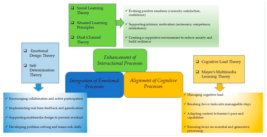 Interactional processes emphasizing collaboration, dialogue, and active participation are central to this framework (Figure 1). The framework draws on Social Learning Theory and Situated Learning Principles [36,44], thus incorporating interactive features like real-time feedback, gamification, and collaborative tools. The proposed framework also aligns with Mayer’s Dual-Channel Theory, which explains that people process verbal and visual information separately, have a limited capacity to process information, and actively process material for meaningful learning. These principles highlight the need for a multimedia design that supports rather than overwhelms learners [21]. These interactive features enhance user engagement and help learners develop critical skills such as problem-solving and teamwork [45].