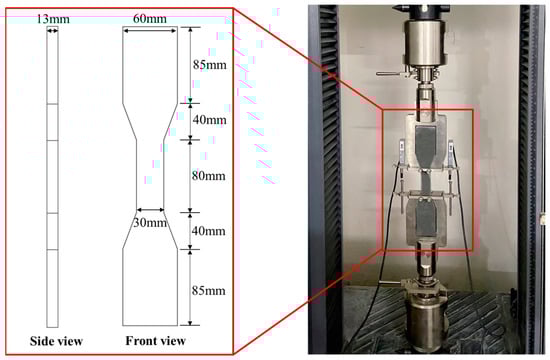 A uniaxial tensile test was carried out by a MTS-universal mechanical (Eden Prairie, MN, USA) testing machine to analyze the ECC’s strain rate and tensile strength. The sample and instrument for the uniaxial tensile test are shown in Figure 2. The testing machine is adopted by displacement control, and the loading speed is 0.5 mm/min []. As for the compressive strength test, the sample with the size of 100 mm × 100 mm × 100 mm was prepared. This study refers to the GB/T50082-2009 standard [] for experimentation with the sulfate corrosion resistance of the ECC. The sample should be soaked in a 5% Na2SO4 solution until it reaches corrosion age. Then, one should take the sample out, dry the surface of the sample, and test its strength and strain rate.