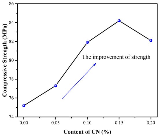 Nanomaterials have been shown to significantly enhance the properties of composite materials. However, they are susceptible to agglomeration, necessitating an investigation into the optimal inclusion level of CNs to enhance the performance of ECCs. The compressive strength data for the ECC samples at 28 d are presented in Figure 3. As observed, the compressive strength of the control sample (without CNs) was 75.2 MPa. The compressive strengths of the CN-ECC samples with 0.05%, 0.10%, 0.15%, and 0.20% CN were 77.3, 81.9, 84.2, and 82.1 MPa, respectively. These values represent increases of 2.79%, 8.91%, 12.0%, and 9.18% compared to the control group. This enhancement is likely due to the nanoscale CN filling the internal pores of the cement matrix and improving the interfacial bonding between the PE and the matrix [], which enables the sample to withstand higher loads. However, when the CN content reached 0.20%, the compressive strength slightly decreased compared to the 0.15% CN sample. At higher CN dosages, the reinforcing effect on the ECC compressive strength appears to diminish. This could be attributed to the formation of hydrogen bonds between the hydrophilic groups on the surface of the CN, leading to the agglomeration of the CN chains, which prevents effective dispersion within the cement matrix and limits its reinforcing potential [].
