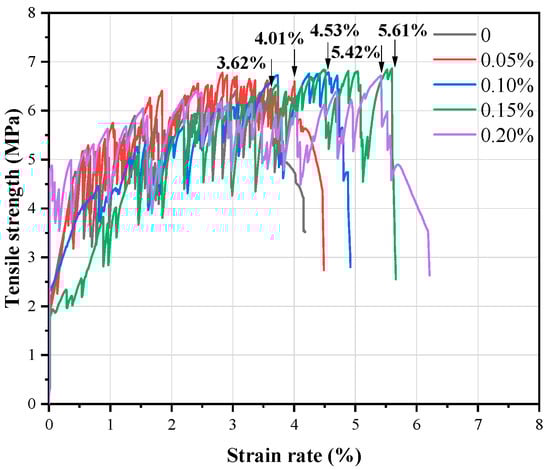 The uniaxial tensile test results for the ECC samples aged for 28 d are presented in Figure 4. Three specimens were tested per sample group, and the average value was taken as the representative result. The strain rate of the control group (without a CN) was 3.62%. For CN-ECC samples incorporating 0.05%, 0.10%, 0.15%, and 0.20% CN, the strain rates were 4.01%, 4.53%, 5.61%, and 5.42%, respectively. The incorporation of CNs enhances the strain rate of ECC samples, with the effect progressively increasing as the CN content rises, though a slight decrease in strain rate is observed at 0.20% CN content. A hydrophilic CN not only fills the internal pores but also interacts with PE fibers and C-S-H, thereby improving the interfacial bond between the PE fibers and the matrix []. This interaction, facilitated by the CN, enhances the bridging effect of the PE fibers within the matrix, distributing the applied load more uniformly and mitigating brittle cracking in cement-based materials, ultimately leading to an improvement in the strain rate of ECCs. The tensile strengths of the five ECC variants are 6.21 MPa, 6.52 MPa, 6.82 MPa, 6.82 MPa, and 6.81 MPa, respectively. The addition of CNs effectively fills the internal pores within the cement matrix, enhances the compactness of the ECC structure, and consequently improves its tensile strength.