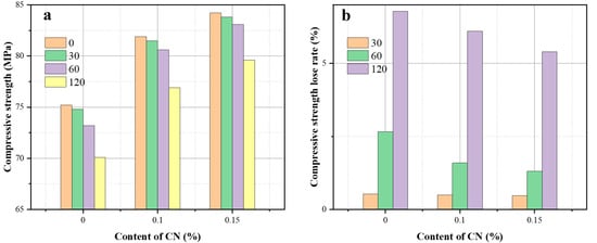 It is obvious that the strain rate loss of the CN-ECC sample under sulfate corrosion is lower than that of the control group, and the CN can effectively alleviate the damage of sulfate on the ECC’s tensile properties. Combined with the compressive strength, strain rate, and sulfate corrosion resistance, it can be seen that when the content of the CN is 0.15%, it has the strongest effect on improving the ECC’s performance.