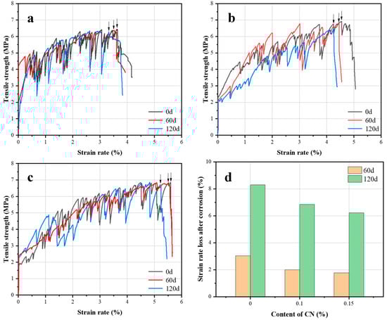 The uniaxial tensile test results of the ECC samples following sulfate corrosion are presented in Figure 6 (The arrow marks the ultimate strain rate on the stress-strain curve). For the control sample (Figure 6a), after 60 and 120 d of sulfate corrosion, the strain rate decreased to 3.51% and 3.32%, respectively, from the initial 3.62%, resulting in a strain loss of 3.04% and 8.29%. For the 0.10% CN-ECC sample group (Figure 6b), the strain rate reduced to 4.44% and 4.22% from the original 4.53%, with strain losses of 1.99% and 6.84%, respectively. For the 0.15% CN-ECC sample group (Figure 6c), the strain rate decreased to 5.51% and 5.26% from the initial 5.61%, showing strain losses of 1.78% and 6.23%.