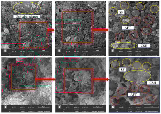 The compressive strength and strain rate of the ECC are closely associated with the internal structure of the matrix. Nanomaterials commonly influence the hydration process of cement, thereby affecting the density of the hydration matrix. Previous studies, utilizing various testing methods, have shown that CNs can enhance cement hydration and increase the density of the cement matrix [,,]. Previous SEM-EDS results from our team showed that when a CN is added to the mortar, it will reduce the calcium–silicon ratio of the hydrated product and increase the density of the hydrated product [,]. In this study, scanning electron microscopy (SEM, Tescan-SEM4000Pro, Xian, China) was employed to observe the microstructure of the ECC matrix. Figure 7a–c display the microscopic morphology of the control sample group (without a CN), where a noticeable unhydrated region is present in the matrix. A substantial amount of spherical silica fume (SF) and a minor quantity of ettringite are observed within the matrix. In contrast, the hydrated morphology of the 0.15% CN-ECC sample, depicted in Figure 7d–f, exhibits significant differences. Here, the matrix structure becomes denser, with more silica fume consumed by the hydration reaction and the formation of increased amounts of ettringite (AFT) and C-S-H. The SEM results indicate that the incorporation of a CN alters the structure of the hydrated matrix, promoting the formation of additional hydration products, which in turn enhances the overall properties of the ECC.