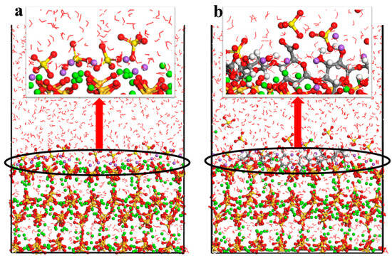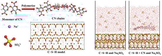 The density distribution of SO42− in Figure 14b exhibits a trend similar to that of water molecules. The presence of the CN reduces the maximum density of SO42− and increases the distance between SO42− and C-S-H from 2.4 Å to 3.1 Å. After the CN adsorbs onto the C-S-H surface, it occupies a spatial region between 2 and 4 Å from the surface, displacing SO42− and thereby increasing the interatomic distance between SO42− and C-S-H. This displacement weakens the interaction between the atomic pairs []. These findings further support the notion that the CN diminishes the interaction between water molecules, SO42−, and C-S-H. The detailed adsorption patterns of sodium sulfate solutions, the CN, and C-S-H are illustrated in Figure 15.