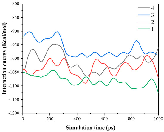 The prevailing perspective on the enhancement mechanism of nanomaterials in cement-based composites suggests that nanomaterials interact with the matrix by adsorbing at the interface, influencing the behavior of water molecules, ion transport, and other properties, thereby affecting the overall characteristics of cement-based materials [,]. Therefore, it is essential to analyze the adsorption properties at the CN and C-S-H interfaces. Adsorption energy serves as a key parameter for intuitively assessing the adsorption behavior at these interfaces. In this study, the adsorption energy between the CN chain and the C-S-H interface was calculated for CN molecular chains in quantities of 1, 2, 3, and 4, respectively. The results, presented in Figure 9, reveal that the adsorption energy at the CN/C-S-H interface ranges from 900 to 1100 kcal/mol, indicating strong adsorption between the CN and C-S-H.