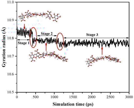 The interface adsorption performance is closely associated with the contact area of the composite interface []. Atomic interactions induce shape alterations of the CN chain, thereby influencing the contact area between the CN and C-S-H. The radius of gyration (Rg) serves as a descriptor for the conformation of the model, where a larger Rg indicates a greater molecular surface area []. The Rg of the CN throughout the simulation is depicted in Figure 10. The evolution of Rg over time can be divided into three distinct stages: 10.84 in stage 1, 10.79 in stage 2, and stabilizing at 10.77 in stage 3. As the simulation progresses, Rg gradually decreases. During the transition from stage 1 to stages 2 and 3, the CN chain undergoes slight twisting and becomes more curved, though it largely maintains a relatively straight form.