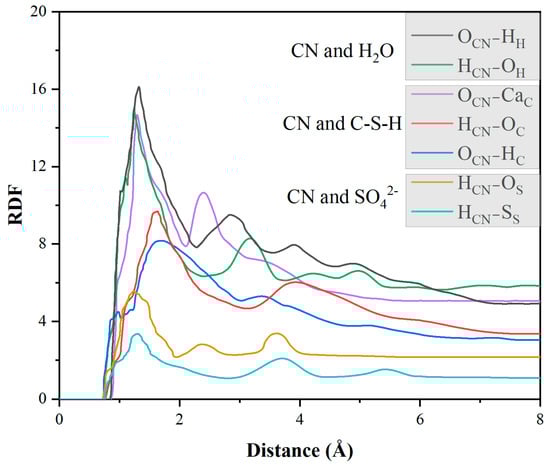 RDF results for CN/C-S-H, CN/SO42−, and CN/water.