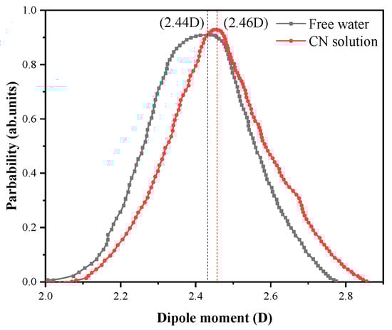 Figure 11 also demonstrates that OCN and HH (H in water), as well as HCN and OH (O in water), exhibit a peak at 1.5 Å, suggesting that the CN can also form hydrogen bonds with water molecules. This is attributable to the presence of numerous hydrophilic -OH and -COO− groups on the CN, which enables its ability to adsorb water molecules. Additionally, the adsorption of the CN to water molecules influences the polarity of the water, which can be quantified through dipole moments. As depicted in Figure 12, the dipole moments of the CN solution and the free aqueous solution are 2.46 D and 2.44 D, respectively. The increased dipole moment of water in the presence of the CN further substantiates the hydrophilicity of the CN [].