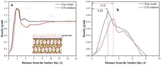 The density distribution of water molecules along the CN adsorption direction (Z-axis) is shown in Figure 14a. The water molecule density reaches a maximum of approximately 1.4 g/cm3 at 1.8 Å from the adsorption interface, indicating the strong hydrophilicity of C-S-H. The presence of the CN slightly decreases the maximum density of water molecules from 1.40 g/cm3 to 1.39 g/cm3, likely due to the hydrophilic CN adsorbing some water molecules and preventing them from approaching the C-S-H surface. Furthermore, the presence of the CN significantly reduces the density of water molecules at distances of 3–5 Å from the interface, as the CN occupies the positions previously held by water molecules after adsorbing onto the C-S-H surface.