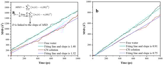 MSD results of water molecules and SO42−. (a) Water molecules; (b) SO42−.