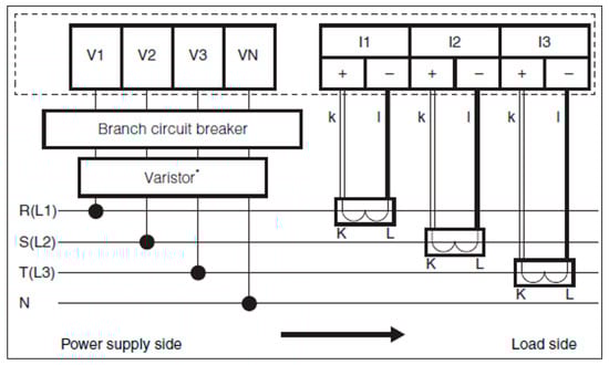 Wiring diagram for measuring active power from machine’s current and voltage. (* A varistor or other surge protection device).