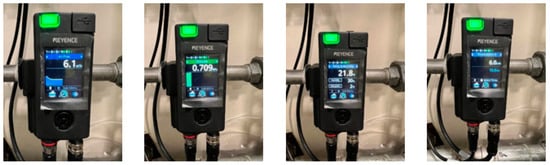 Once installed and configured, the MP-F sensor began visualizing and recording real-time airflow, pressure, temperature, humidity, and power consumption, as seen in Figure 7. Additionally, users can connect directly via USB and KEYENCE’s dedicated software (Version 1.1.1.0) to access detailed reports, including daily, weekly, and monthly energy consumption logs. The sensor can store up to one year of data, which can also be exported in CSV format for further analysis.