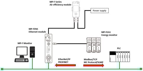 The network architecture illustrating the sensor’s connection is shown in Figure 8. MP-F Monitor software (Version 1.1.1.0) is used for initial sensor setup, parameter configuration, and real-time monitoring. Utilizing Modbus/TCP and EtherNet/IP, the software provides remote access to sensor data, energy consumption trends, and system diagnostics, significantly enhancing efficiency, energy management, and predictive maintenance capabilities across M-ACE’s production environment.