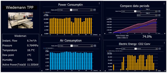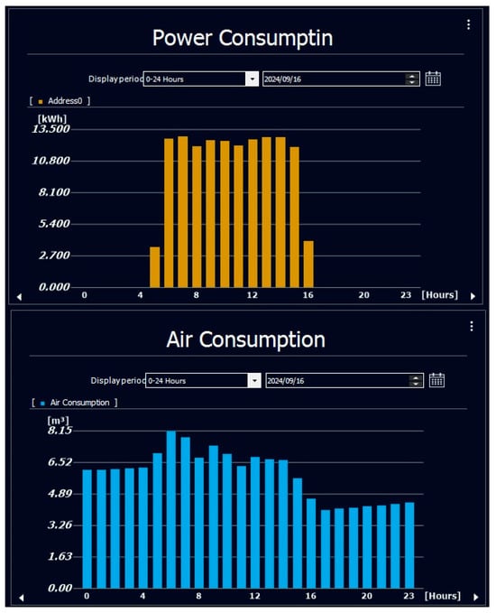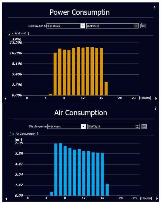 To visualize the energy and air consumption of the Wiedemann TPP, an interactive, real-time dashboard (Figure 9) was developed using Keyence’s dedicated software. This dashboard provides both live operational data and historical performance trends, accessible to authorized users within the M-ACE network.