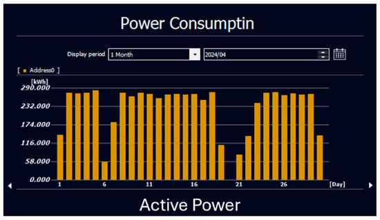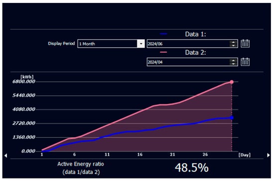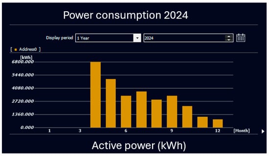 Further analysis over the following months (Figure 14, Table 1) confirmed a steady improvement in energy efficiency. The high consumption recorded in April 2024 was never repeated, establishing a benchmark for energy-saving measures. Monthly savings ranged from a minimum reduction of 1741 kWh (25.7%) in May to a maximum of 4564 kWh (56%) in October 2024, demonstrating the success of data-driven optimization strategies.