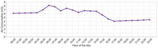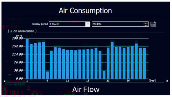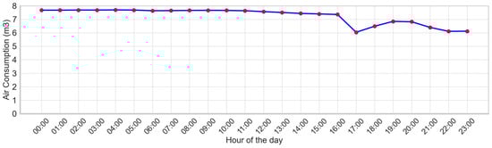 It was noted on September 16th that, even when the machine was completely powered off between 4 a.m. and 5 p.m. (Figure 17 and Figure 18), air consumption remained consistently high at 4–6 m3/h, indicating a persistent air leak. This ongoing leakage increased the load on the factory’s air compressors, which supply compressed air for production. Consequently, the compressors had to operate at a higher capacity, leading to increased power consumption and rising operational costs.