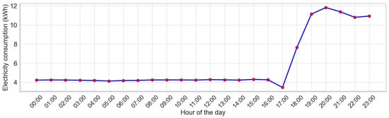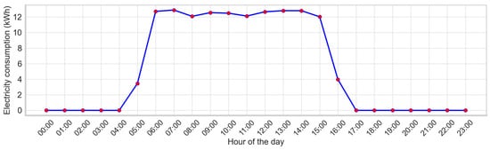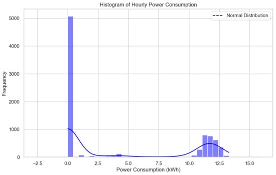 As discussed in Section 2.1, the machine was frequently idle in automatic mode due to production scheduling uncertainties. Analysis of the hourly electricity consumption distribution (Figure 12) indicated that values below 10 kWh per hour corresponded to non-operational periods.