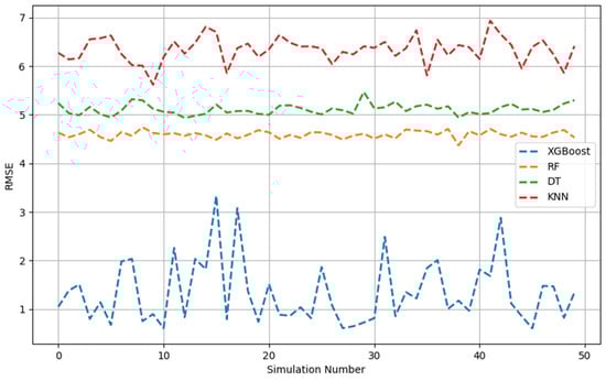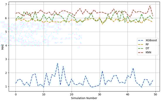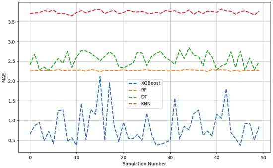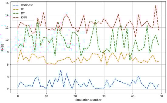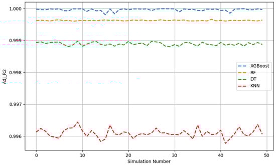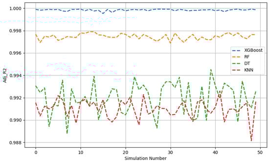 The test stage, as illustrated in Figure 4, Figure 5 and Figure 6, revealed that, based on the decreasing order of the prediction performance of the models, the models ranked as follows: XGBoost, RF, DT, and KNN. This was similar to the preceding analyses. Overall, the XGBoost model demonstrated very strong predictive performance across 50 simulations, indexed by the relatively high adj. R2 values and low RMSE and MAE values. In contrast, the XGBoost model was much more consistent compared with the other three models given that, even after 50 iterations, the amplitude of the variation of all indicators was negligible.