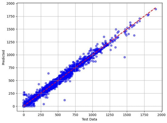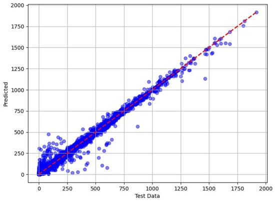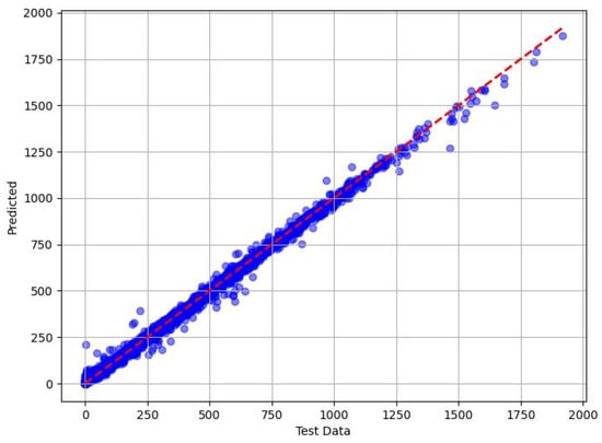 The scatter plots in Figure 7, Figure 8, Figure 9 and Figure 10 show the correlation between the measured methanol quantities and the predicted values from the XGBoost, RF, DT, and KNN models for gas pipeline samples. The XGBoost model exhibited exceptional predictive performance for determining the minimum methanol quantity required for hydrate inhibition. During the training phase, it achieved a mean absolute error (MAE) of 0.3693, indicating an average prediction error of just 0.3693 units compared with the actual methanol quantities in the training dataset. This low MAE underscored XGBoost’s ability to closely fit the training data. In the testing phase, the MAE slightly increased to 0.943, reflecting a modest rise in prediction errors when applied to unseen data, yet still demonstrating high accuracy. The RMSE further supported this with values of 0.6023 (training) and 2.066 (testing), indicating that larger errors, while present, remained minimal and manageable. The adj. R2 metric, which measured the proportion of variance in the target variable explained by the input features, was 0.999 for both the training and testing phases. This near-perfect score suggests that XGBoost captured 99.9% of the variability in methanol requirements, reflecting its robust fit with the training data and excellent generalization to the test set. These results highlight XGBoost’s superior reliability and precision in predicting methanol quantities across diverse pipeline conditions.