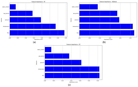 A feature importance analysis was conducted to assess the influence of the five input features (flow rate, temperature, pressure, gas specific gravity, and water content) on predicting the minimum methanol quantity required. This analysis elucidated each feature’s contribution to the predictive performance of the XGBoost, RF, and DT models, computed via scikit-learn and XGBoost libraries in PyCharm. Feature significance was derived from the models’ intrinsic properties, which ranked features based on their role in reducing prediction errors across tree splits [37]. KNN, lacking an inherent importance metric, was excluded from this evaluation.
