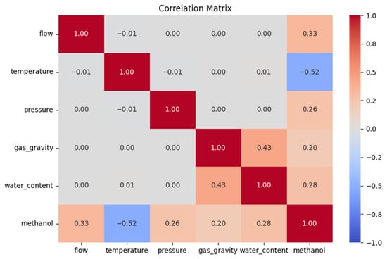 To explore the relationships between the five input features (flow rate, temperature, pressure, gas specific gravity, and water content) and the minimum methanol injection rate required, a correlation matrix analysis was conducted. Visualized in Figure 12, this analysis used Pearson correlation coefficients (r) from −1 to 1 to quantify linear dependencies, shedding light on the feature influences on methanol dosing for hydrate inhibition. These findings complemented the machine learning models’ predictions and feature importance analysis, offering a linear perspective to guide operational decisions.