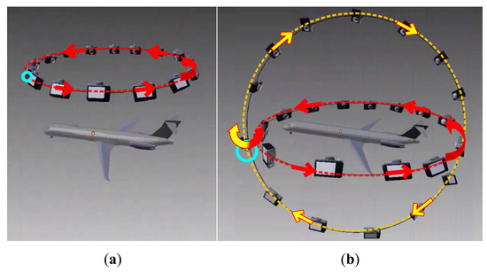 As illustrated in Figure 2, (a) shows a top-view scheme where cameras are placed around the 3D object, elevated 60 degrees from the ground plane. However, the top-view scheme has blind spots, so the whole structure of the 3D object cannot be captured. Therefore, Figure 2b provides another scheme that avoids the occurrence of blind spots. The surround-view scheme provides two circle trajectories with a cross-view for covering enough object faces. In addition, all the cameras should point toward the centroid of the 3D object.