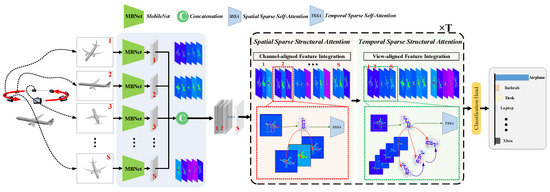 Architecture of proposed MSSAViT in detail. By formulating a reasonable observation method to render ordered continuous view images and then using Mobilenet as the backbone feature extraction network to extract intermediate feature maps for each view image (rather than the feature vectors), we can construct a temporal multi-channel feature maps through concatenation. This is then fed into the core Multi-head Sparse Self-Attention Network for multiple rounds of feature learning. In the SSSA module, for the S-view feature maps, feature extraction is performed only on the channel-aligned feature maps under the same view through dimension transformation operations. In the TSSA module, temporal–structural attention feature learning is carried out for the S continuous-view images with the same frequency features. Based on this, through T rounds of feature learning, the spatial–temporal feature expression ability is enhanced, and finally, the category probability is output through the fully connected layer.