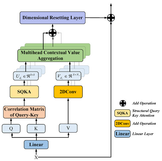 Temporal/Spatial Sparse Structural Attention. For the input feature map x, in accordance with the classic transformer principle, we utilize linear layers to construct the Query (Q), Key (K), and value (V) matrices. Subsequently, the correlation matrix of Q and K is obtained through matrix multiplication operations. Based on the SQKA module, the multi-head structured features of Q-K are derived. Simultaneously, the value V matrix is processed through a 2D convolutional layer to obtain value features with the same number of heads. Finally, the aggregation feature of each head is obtained through multi-head contextual value aggregation. Thereafter, the multi-head features are summed via an addition operation. Ultimately, a skip connection is added to the original input feature map x to enhance the convergence speed of the model.