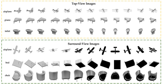 We conducted comparative experiments against state-of-the-art methods in 3D object recognition on ModelNet10 and ModelNet40. The ModelNet40 dataset contains 12,311 3D objects distributed across 40 categories, while its subset ModelNet10 includes 4839 objects categorized into 10 classes. Figure 5 illustrates representative images generated through two distinct sequential-view capturing schemes discussed in Section 3.1. In the comparative experiments, the average class accuracy and average instance accuracy were employed as metrics for evaluating the performance of different methods. To ensure a fair comparison, ensemble methods were excluded from the evaluation, our approach was benchmarked against existing methods based on distinct 3D data representations.
