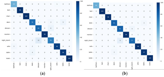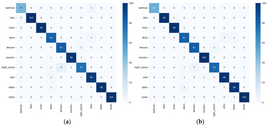 Confusion matrices of (a) MSSAViT-TV and (b) MSSAViT-SV on Modelnet10.