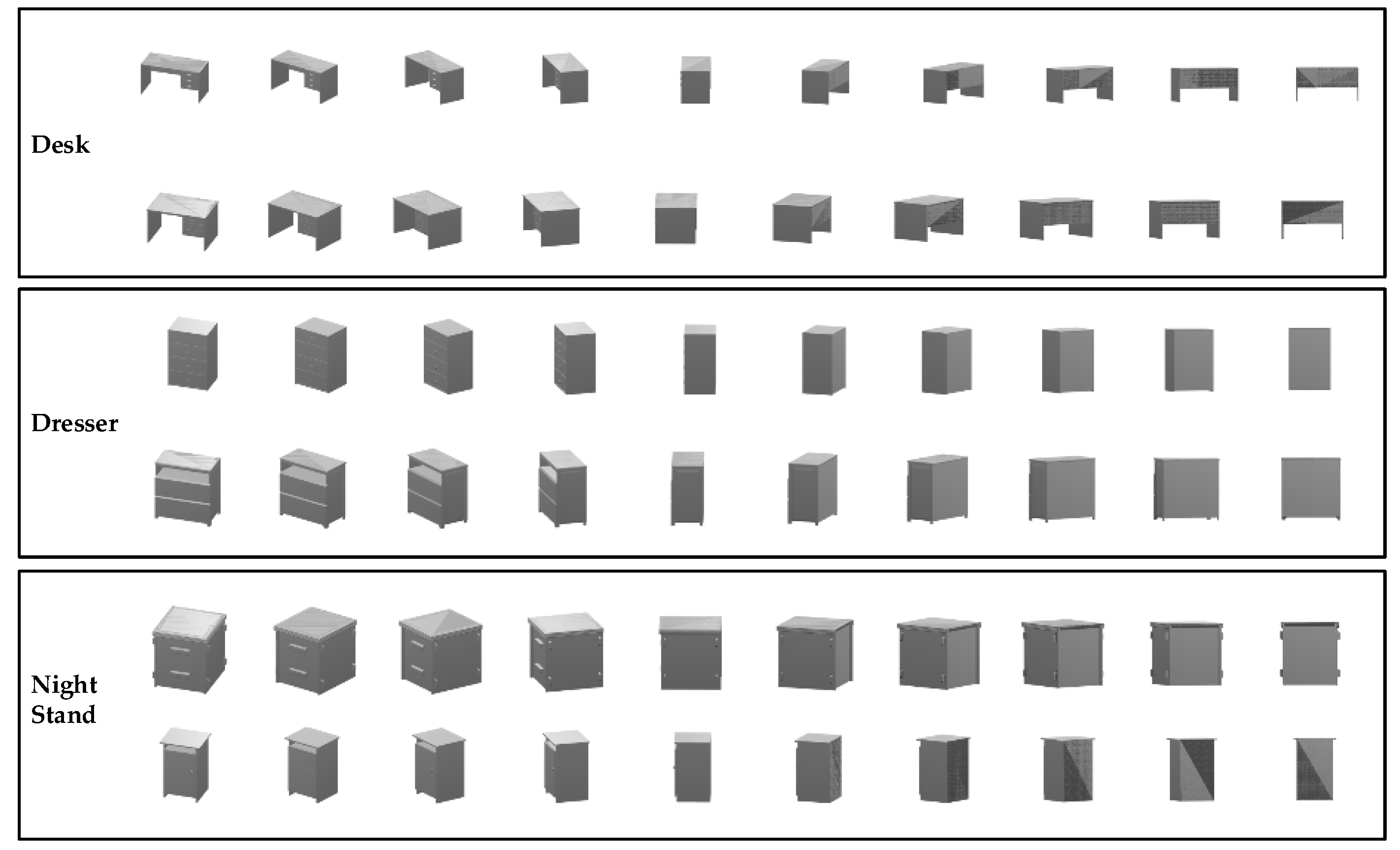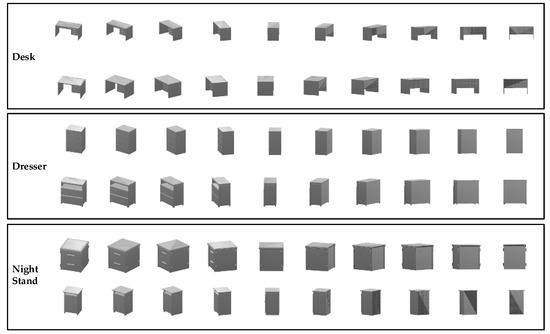 We conducted an in-depth analysis of the impact of the SSSA and TSSA modules on the recognition results using ModelNet10 as an example. Figure 8 shows the confusion matrices of the SSSA-only and TSSA-only models. Comparative analysis revealed that the largest recognition errors were concentrated in the desk, dresser, and nightstand categories. In Figure 9, we present typical samples of these three categories. Their main characteristic is that there is great similarity in appearance and structure, especially from the sides and top view. However, the significant difference that distinguishes a desk from the other two is the hollowed-out area under the desktop. In contrast, the difference between a dresser and nightstand lies in the table legs and the relationship between the tabletop and the main body (the tabletop is a bit wider than the main body). Through Spatial and Temporal Structural Attention, it is possible to learn local and global structural semantic features jointly, and the ablation experiment confirmed the effectiveness of these two modules.