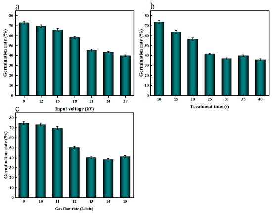 Figure 2c illustrates that with an increased gas flow rate, the sprouting rate first declines and then peaks at 13 L/min. The gas flow rate plays a crucial role in plasma discharge, significantly influencing the stability of the discharge and the generation of reactive species. Research indicates that as the gas flow rate increases, the plasma jet’s length and distribution also expand correspondingly. However, excessively high gas flow rates may induce instability in the plasma jet. Conversely, lower flow rates result in a higher concentration of reactive species, as the plasma has a longer residence time in the target area, thus facilitating the generation of additional reactive species [23]. Therefore, the selected gas flow rate range in this experiment was between 9 and 13 L/min.