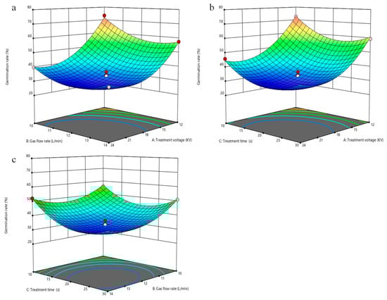 Figure 4 shows the impact of the interaction levels of various factors on potato germination rats. As shown in Figure 4a, it can be observed that the potato weight loss rate initially decreases and then increases with increasing treatment voltage and gas flow rate. As depicted in Figure 4b, the potato weight loss rate increases with increasing treatment time and initially decreases before increasing with the rise in treatment voltage. As depicted in Figure 4c, the potato weight loss rate increases with increasing treatment time and initially decreases before increasing with the gas flow rate. Among them, the interaction between treatment voltage (A) and gas flow rate (B) is the most significant, followed by the interactions between treatment voltage (A) and, treatment time (C) and gas flow rate (B). Therefore, it can be concluded that, within a certain range, appropriately increasing treatment voltage and gas flow rate contributes to a reduction in the potato weight loss rate.