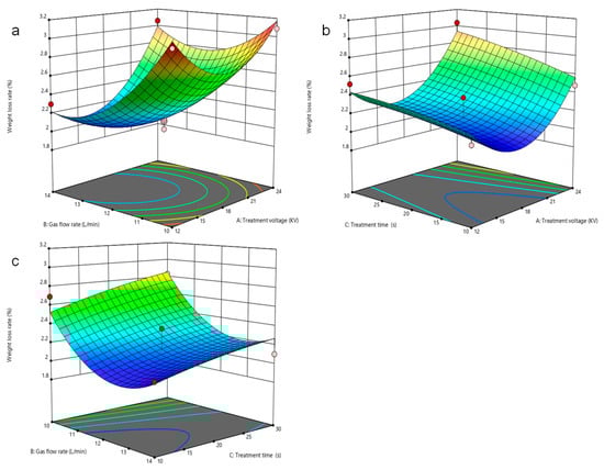 As shown in Table 4, the effects of A, B, C, AB, A2, and B2 on the model are highly significant (p < 0.01), while the BC effect shows moderate significance (p < 0.05). The primary and secondary influences of treatment voltage, treatment time, and gas flow rate on the weight loss rate are as follows: treatment voltage > treatment time > gas flow rate.