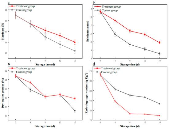 Hardness and brittleness are critical factors in assessing the texture of potatoes [24]. The softening of potatoes during storage directly affects their quality, subsequently influencing attributes such as taste and appearance. The impact of plasma treatment on potato hardness is depicted in Figure 5a. Potato hardness exhibits a general decreasing trend throughout the storage period, with significant differences observed during the later stages. There was no significant difference in hardness between the control and treated groups from the very beginning to the fourth day. From the fourth to the sixteenth day, the trend of decreasing hardness became slower in the treated group compared to the control group. On the sixteenth day, the hardness of the treated group increased by 6.06% compared with that of the control group, likely due to water consumption during potato sprouting, which causes a breakdown of cell structure and a subsequent decrease in hardness [25].