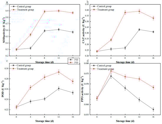 SOD, a metal-based antioxidant enzyme, plays a vital role in regulating the equilibrium of reactive oxygen species (ROS) within the organism [29]. It is crucial for maintaining the equilibrium between oxidation and antioxidant processes. As shown in Figure 6a, both control and plasma-treated groups showed a steady increase in SOD activity with increasing storage time. After 16 days of storage, SOD activity was significantly enhanced in the treated group compared to the control group. After 16 d of storage, the SOD activity in the plasma-treated group increased by 52.63%, which significantly exceeded the level observed in the control group, which could be attributed to the promoting effect of plasma treatment. This result aligns with previous studies, which found that higher SOD activity decreased the germination rate of rice seeds, emphasizing the critical role of SOD activity in delaying seed germination [30].