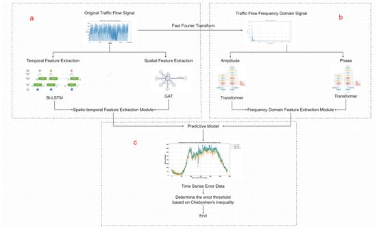 Based on the above issues and situation analysis, this paper proposes a prediction-based anomaly detection method for traffic flow data that incorporates multi-domain feature extraction. This method leverages both time-domain and frequency-domain features to comprehensively capture the temporal and spectral characteristics of the data, enabling the construction of an effective time series prediction model. By analyzing the predicted and observed values, the error threshold is determined using Chebyshev’s inequality, and anomalies are detected by checking whether the error falls within the threshold range. This approach enables effective detection of anomalous data points.