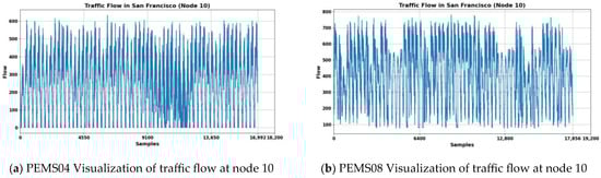 We expanded the time range and visualized the results, as shown in Figure 13 and Figure 14. Specifically, Figure 13a shows the traffic flow from the first to the fifth day in the PEMS04 dataset, while Figure 13b shows the traffic flow from the seventh to the eleventh day in the PEMS04 dataset. Figure 14 shows the traffic flow from the fifth to the ninth day in the PEMS08 dataset. The data points in the figures represent the coordinates of the data points that were not detected by our method, as well as the coordinates of the two days before and after each of these points.